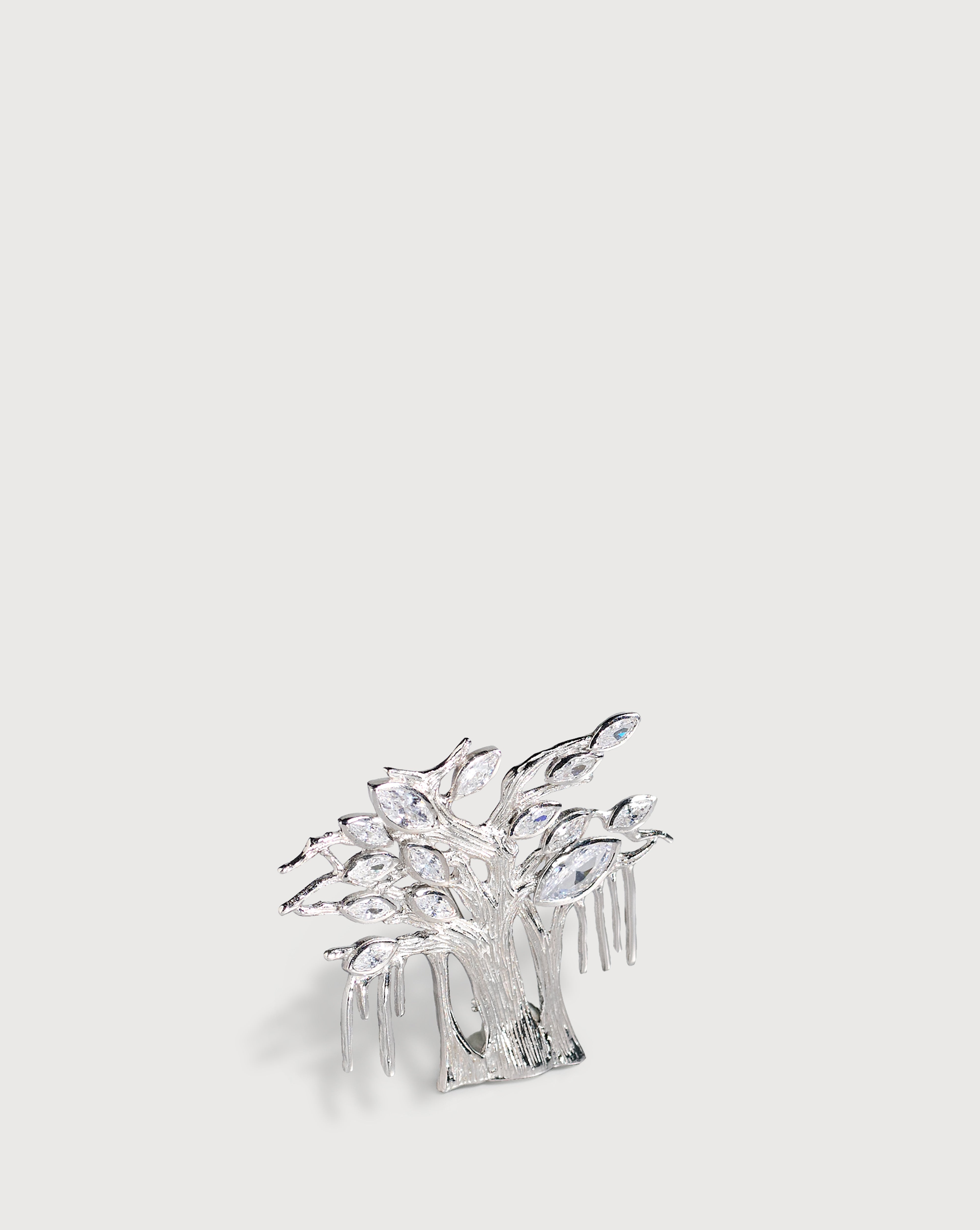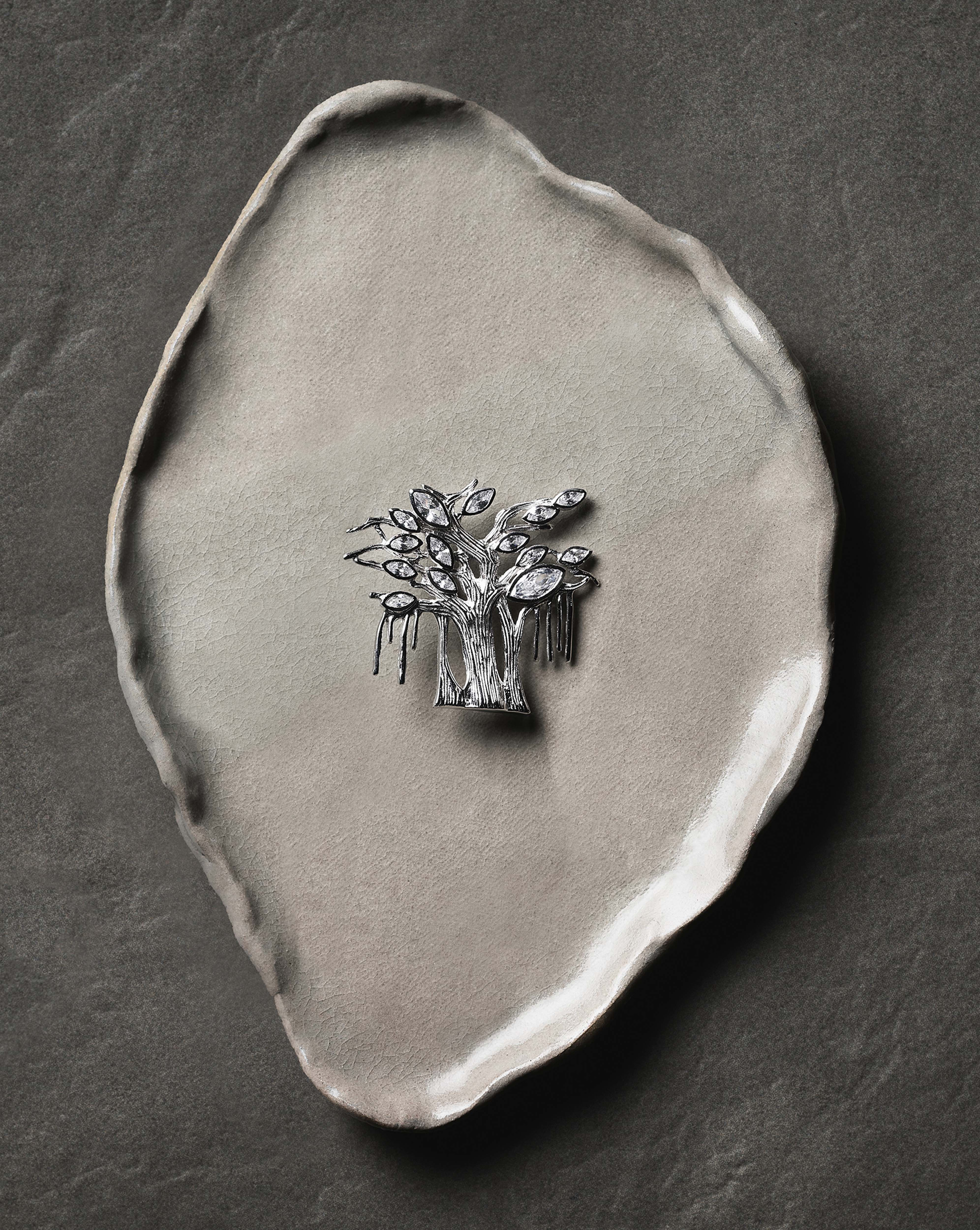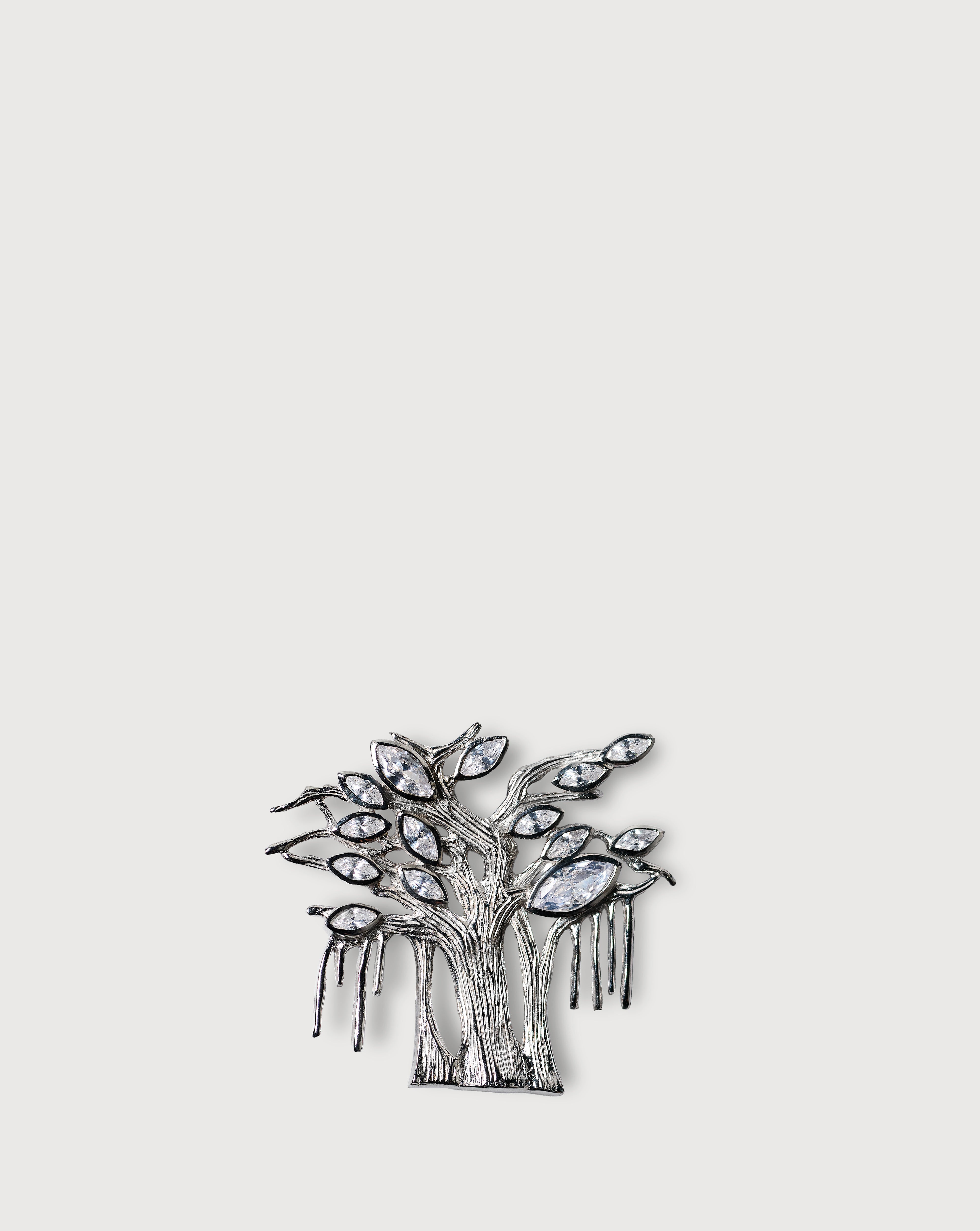 Inspired by the iconic Banyan Tree emblem, this sculptural brooch is handcrafted in sterling silver by skilled Thai artisans. Accented with shimmering zirconia, its organic form, shaped by fourteen symbolic leaves and textured trunk patterns, reflects roots, connection, and the enduring strength of nature.